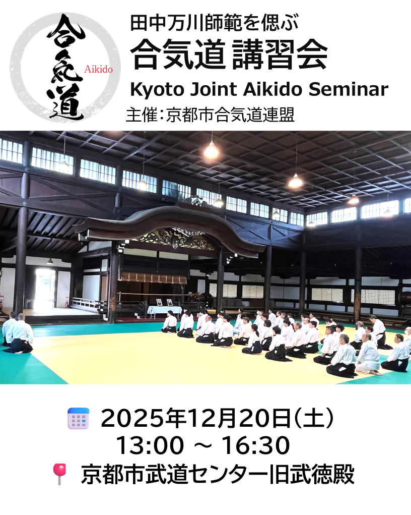 12月20日(土)、京都市合気道連盟主催の「田中万川師範を偲ぶ講習会」を開催いたします。歴史ある京都市武道センター旧武徳殿で、心と技を深めるひとときをご一緒しましょう。 お時間のある方は、講習会後の懇親会にも是非ご参加ください。